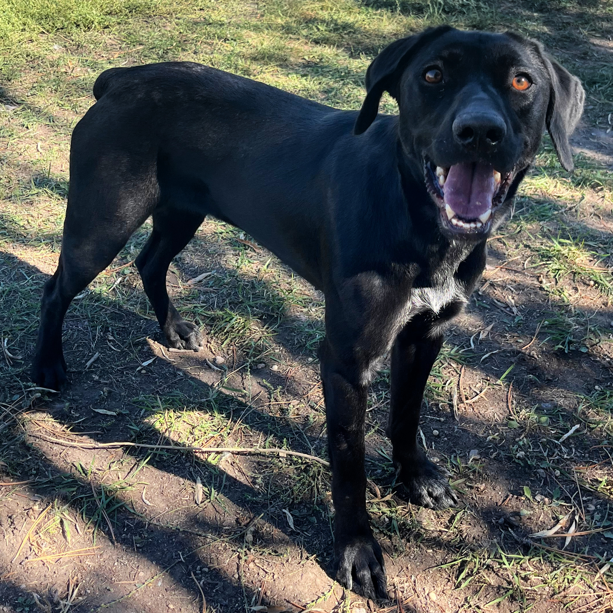 Blair is 1 to 3 years old. She has been available for adoption since 10/3/2025. Blair is a pretty girl. She is full of energy and is excited to see everyone. She loves attention and will do whatever she can to get love from you. She enjoys playing fetch and is really smart. Blair would do best with a home with a yard. Blair seems to know the command “sit,” but would benefit from some training.